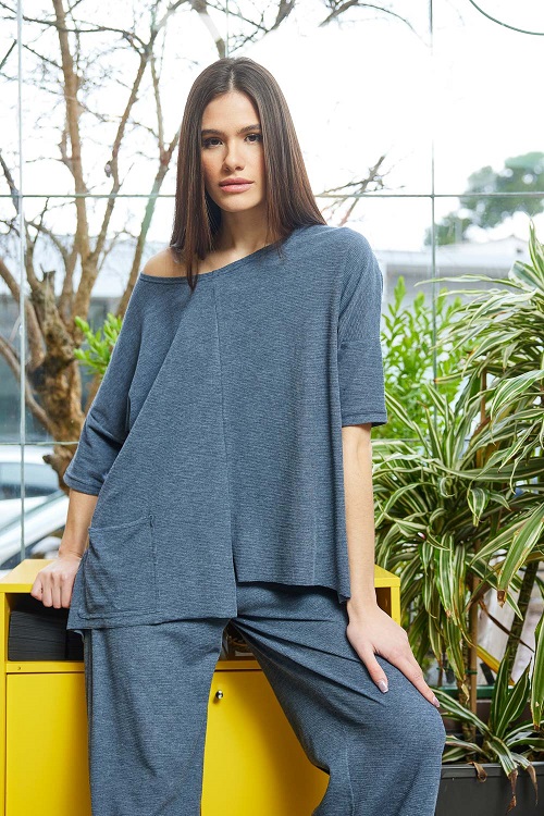 Μπλούζα ασύμμετρη με κοντό μανίκι και τσέπη σε άνετη γραμμή